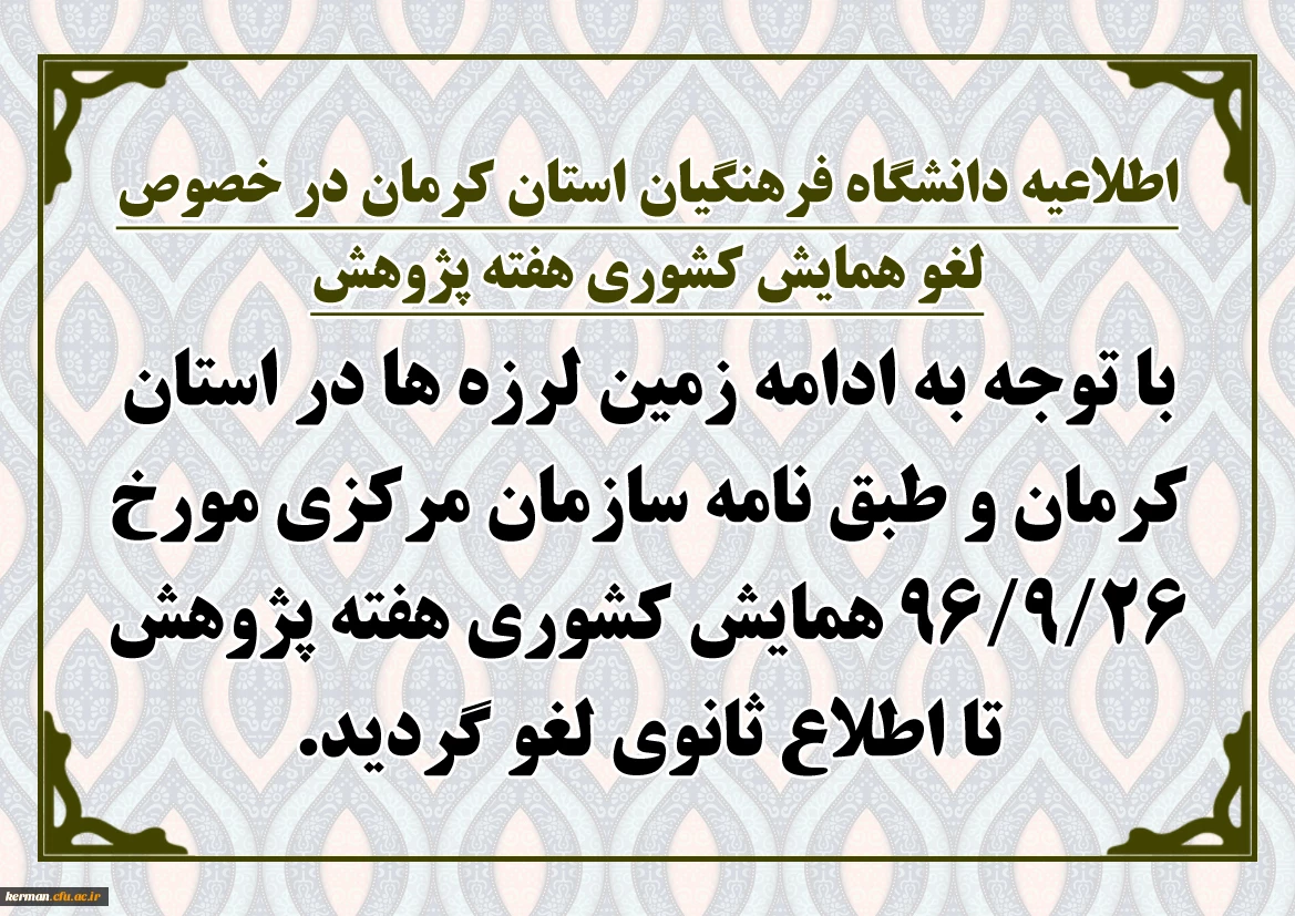امتیاز دهید : اطلاعیه دانشگاه فرهنگیان استان کرمان در خصوص لغو همایش کشوری هفته پژوهش چهارشنبه 22 آذر 1396 ساعت 15:45