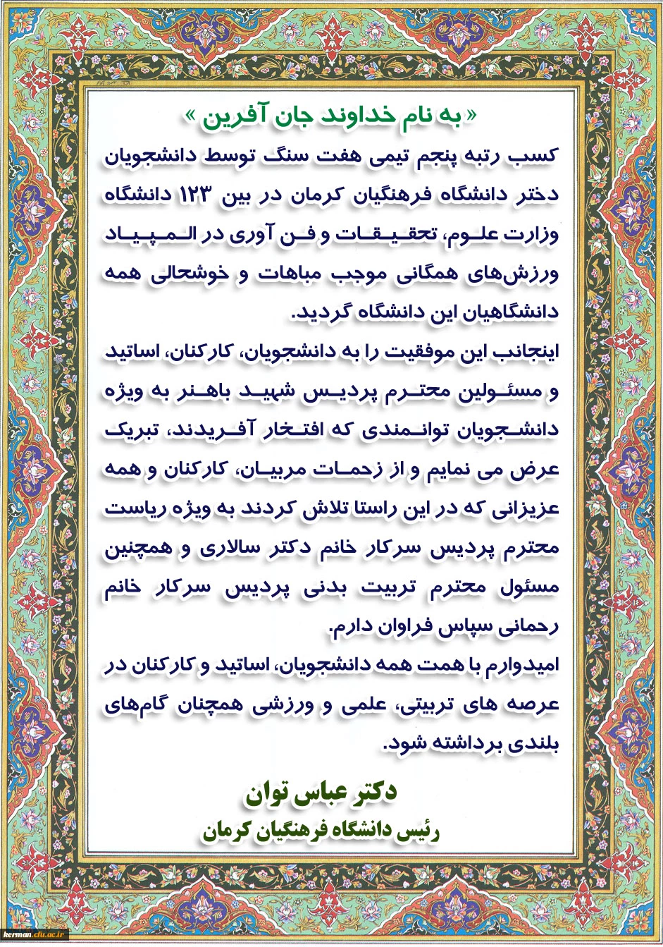 پیام دکتر توان رئیس دانشگاه فرهنگیان استان به مناسبت موفقیت دانشجو معلمان دختر در المپیاد ورزشهای همگانی وزارت علوم